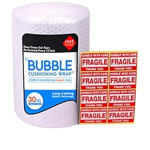 Bubble Cushioning Wrap Roll for Packing (3/16″, 12″ x 30 ft), Easy-to-Tear 12″ Sheets, Plus Free 8 ‘Fragiile, Handle with Care’ Stickers