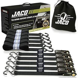 JACO Ratchet Tie Down Straps (4 Pack) – 1 in x 15 ft | AAR Certified Break Strength (1,823 lbs) | Cargo Tie Down Set with (4) Utility Ratchet Straps, (4) Bundling Straps, and Accessories (Black)
