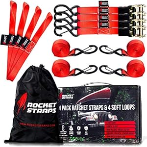 Rocket Straps – Ratchet Straps | 1″ x 17′ – 1760lbs Break Strength Ratchet Tie Down Straps | 4 Ratchets & 4 Soft Loops | Ratchet Strap Bag | Use with Moving, Motorcycle, Trailer & Trucks…