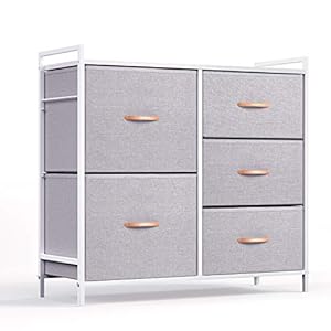 Dresser Organizer With 5 Drawers. Fabric Storage Chest for Bedroom, Hallway, Entryway, Closets, Nurseries. Furniture Storage Tower Sturdy Steel Frame, Wood Top, Easy Pull Handle Textured Print Drawers