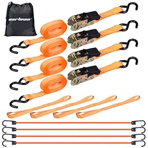 Ratchet Tie Down Straps – 4 Pk – 15 Ft- 500 Lbs Load Cap- 1500 Lb Break Strength- Cambuckle Alternative- Cargo Straps for Moving Appliances, Lawn Equipment, Motorcycle – Includes 2 Bungee Cord