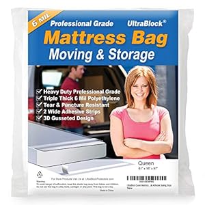 UltraBlock Mattress Bag for Moving, Storage or Disposal – Queen Size Heavy Duty Triple Thick 6 Mil Tear & Puncture Resistant Bag with Two Extra Wide Adhesive Strips