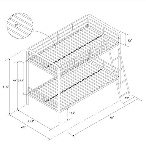Simple, sleek, secure, stable and space-saving, DHP’s Twin-Over-Twin Metal Bunk Bed meets all your needs and expectations. Easy to assemble, the bunk bed has been designed for the utmost safety, providing full-length guardrails and a ladder that attaches to the frame. Accommodating two twin mattresses, the black metal frame will last through years of rough play, whether hosting twins, friends, family or siblings.