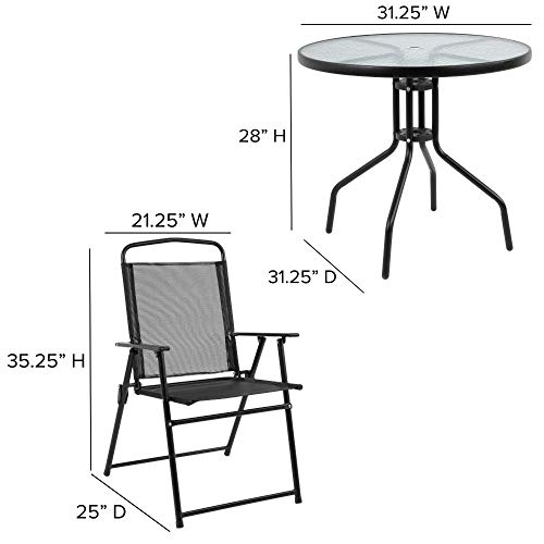 Take advantage of the nice weather and eat your meals on the patio on this stylish 6 Piece Black Patio Garden Table Set with Umbrella. You can enjoy this set quickly, assembly of the table goes up in minutes and the chairs come fully assembled. The folding chairs are upholstered in a durable textilene material, designed for all-weather use. If you want to relocate your seating to another location on the deck, sit poolside or take with you while camping or to an outdoor sporting event, the lightweight and compact design offers an easy to transport option. The attractive rippled tempered glass sits atop a 4-legged metal framed base. The included umbrella will shade you on those sunny days and has a tilt function that is activated by pushing the plastic ring on the pole. For longevity, care should be taken to protect from long periods of wet weather. Clean with a water based cleaning solution to keep in pristine condition. Take the stresses of the day away with this all-in-one table set that was built for dining, entertaining, relaxing and card games. [GM-202012-BK-GG]