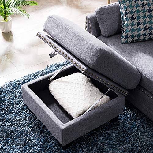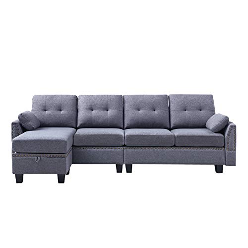 Fashionable Appearance- HONBAY 4-seat sectional couch sofa with nail-head trim and storage bag. Mid-century modern fabric with sectional sofa with reversible chaise lounge.