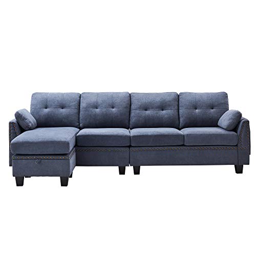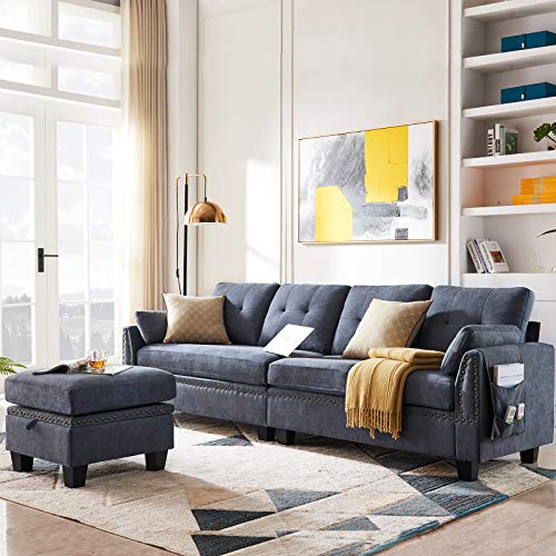 Fashionable Appearance- HONBAY 4-seat sectional couch sofa with nail-head trim and storage bag. Mid-century modern fabric with sectional sofa with reversible chaise lounge.