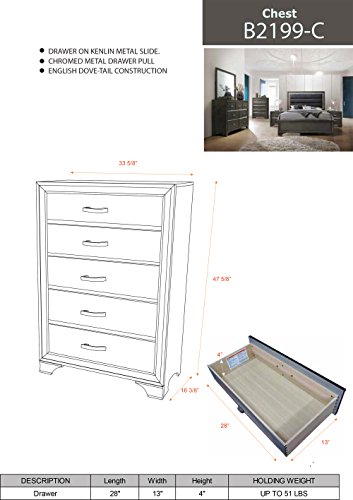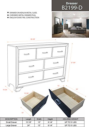 - Dresser: 58″W x 16″D x 37″H – 120 LBS