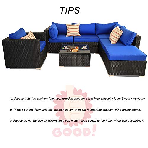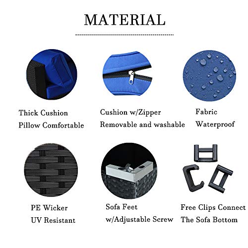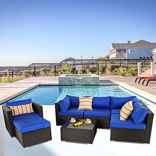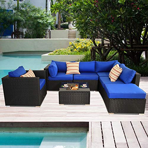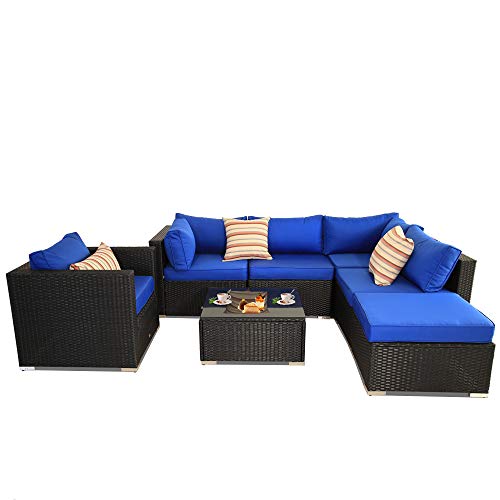 Patio Sectional Sofa Outdoor Black Rattan Couch Set Wicker 7PCS Sectional Conversation Sofa Set Lawn Garden Patio Furniture Set with Royal Blue Cushion