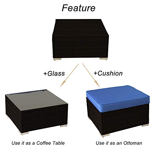 Garden Couch Size: -single sofa:31.5″W x 29.5″D x 25.6″H,Seat: 17.4”H (with cushion) -Ottoman: 25.6″Wx23.6″Dx17.4”H (with cushion) -Corner sofa: 29.5″W x 29.5″D x 25.6″H,Seat: 17.4”H (with cushion) -Middle sofa: 25.6″W x 29.5″D x 25.6″H,Seat: 17.4”H (with cushion) Ottoman&Coffee table: 25.6″L x 25.6″W x 17.4”H(with cushion)/13.4”H(without cushion)