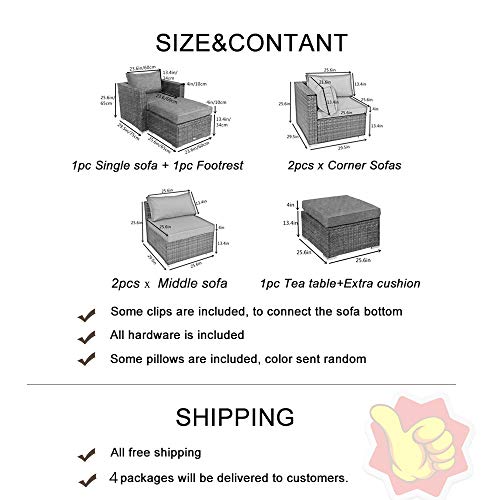 -Patio Sofa set Includes:It includes: -1 x Single sofa -1 x Ottoman -2 x Corner sofa -2 x Middle sofa -1 x Coffee table and extra cushion -12 x Clips -1 x Instruction Manual -1 x Hardware+some pillows