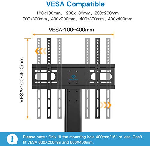 ✅ UNIVERSAL DESIGN Universal TV mounting bracket design fits most 37″ – 55″ flat-panel LCD/LED/Plasma/curved TVs holds up to 88lbs VESA(mounting hole pattern) – compatible faceplate fits VESA 100X100mm (4”x4”) 200X100mm (8″x4″) 200X200mm(8″x8″) 300X200mm (12″x8″) 300X300mm (12″x12″) 400X300mm (16″x12″) 400X400mm (16″x16″) Please be noted this tv base only works if mounting hole is 16″ or less and can’t fit VESA 600X200mm(24″X8″) and 600X400mm (24″X16″)