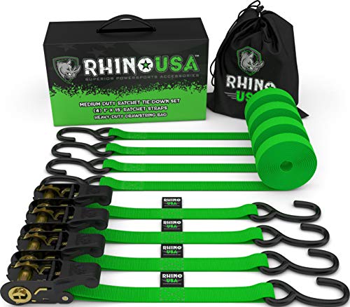 RHINO USA Ratchet Tie Down Straps (4PK) – 1,823lb Guaranteed Max Break Strength, Includes (4) Premium 1″ x 15′ Rachet Tie Downs with Padded Handles. Best for Moving, Securing Cargo (GREEN)