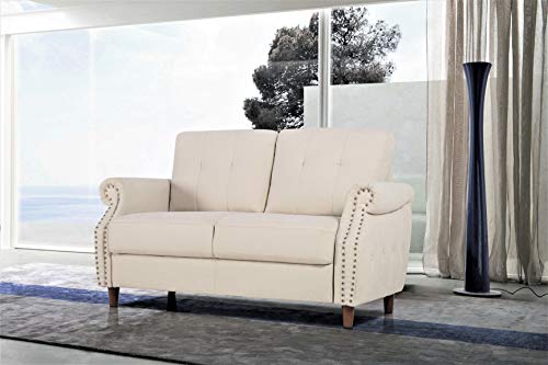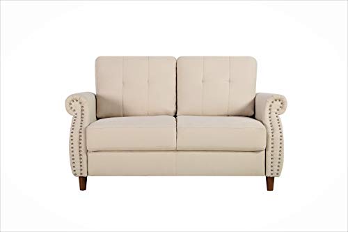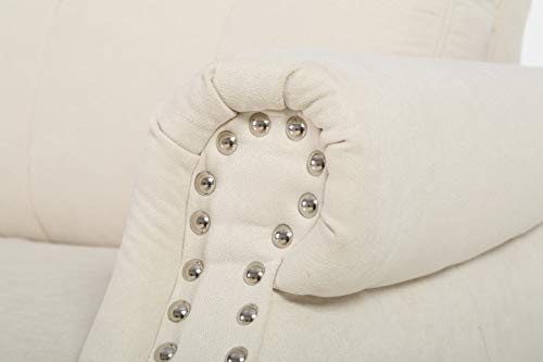 Tasteful and transitional, this elegant sofa makes an excellent addition to any seating ensemble. Founded on a solid pine wood frame, this sofa strikes a dramatic silhouette with a full backrest, rolled arms, and four bun feet. accented by antiqued nail head trim. Rounding out the design, sinuous spring suspension supports medium-firm high-density foam and synthetic fiber cushions, accented by button tufting and gleaming nail head trim. this sofa is an excellent addition to your living room seating ensemble.